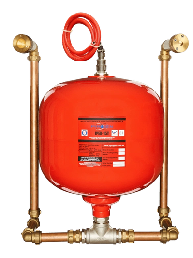 Built with a steel casing, the IPEX-15 T houses ABC extinguishing powder, a gas-aerosol generator, and an electrical actuator.